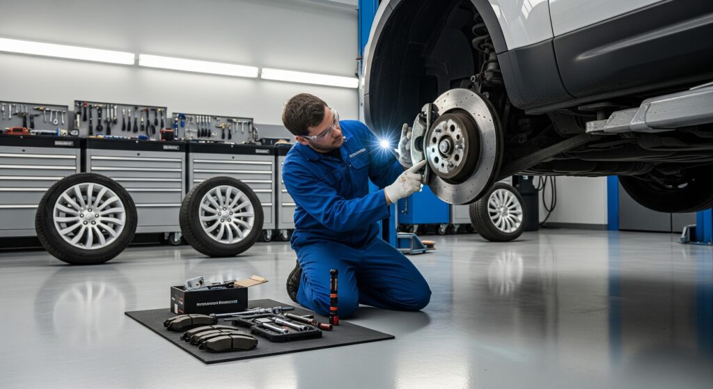 Pads, rotors, brake lines, and hydraulic pressure are evaluated for wear, corrosion, and safety. ABS and electronic braking assist systems are tested and logged.