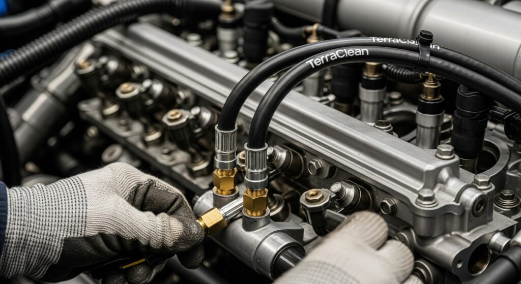 We use the official TerraClean system and fluids, ensuring maximum cleaning effectiveness and engine safety.